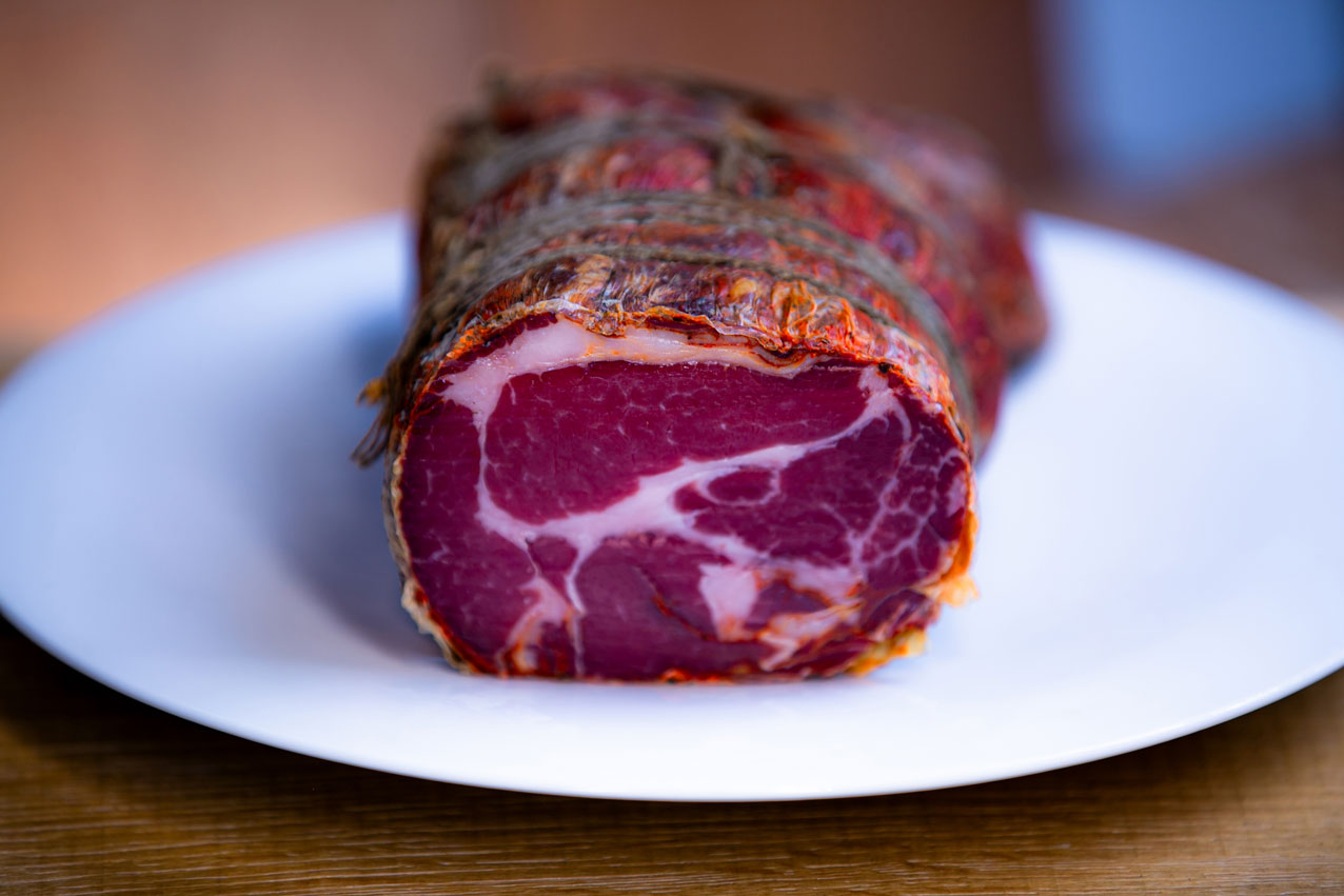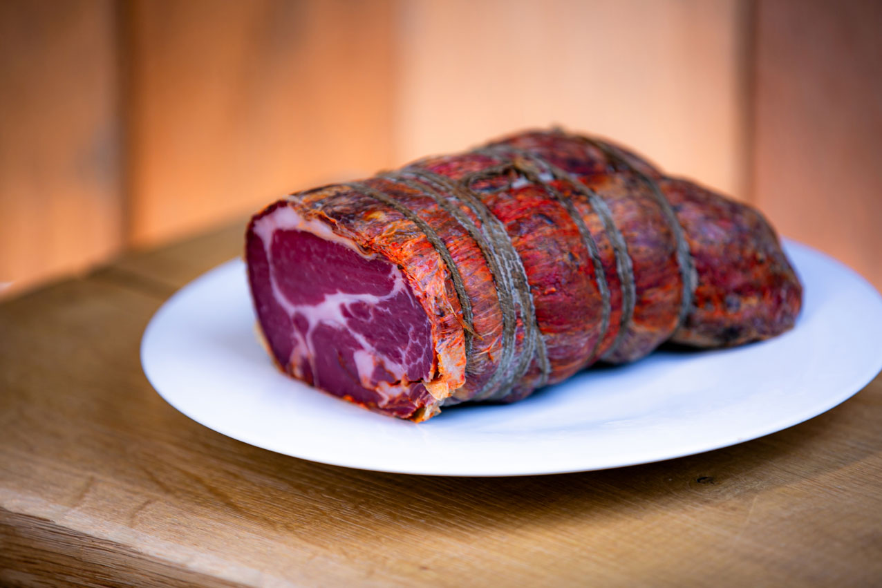 Prepared with te muscular part of the pig's neck. The meats, after two salting processes, closed to each other, and the related massages to favor the penetration of the salt, are stuffed into natural casing.