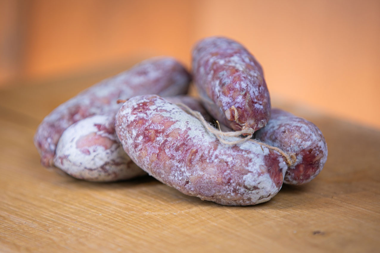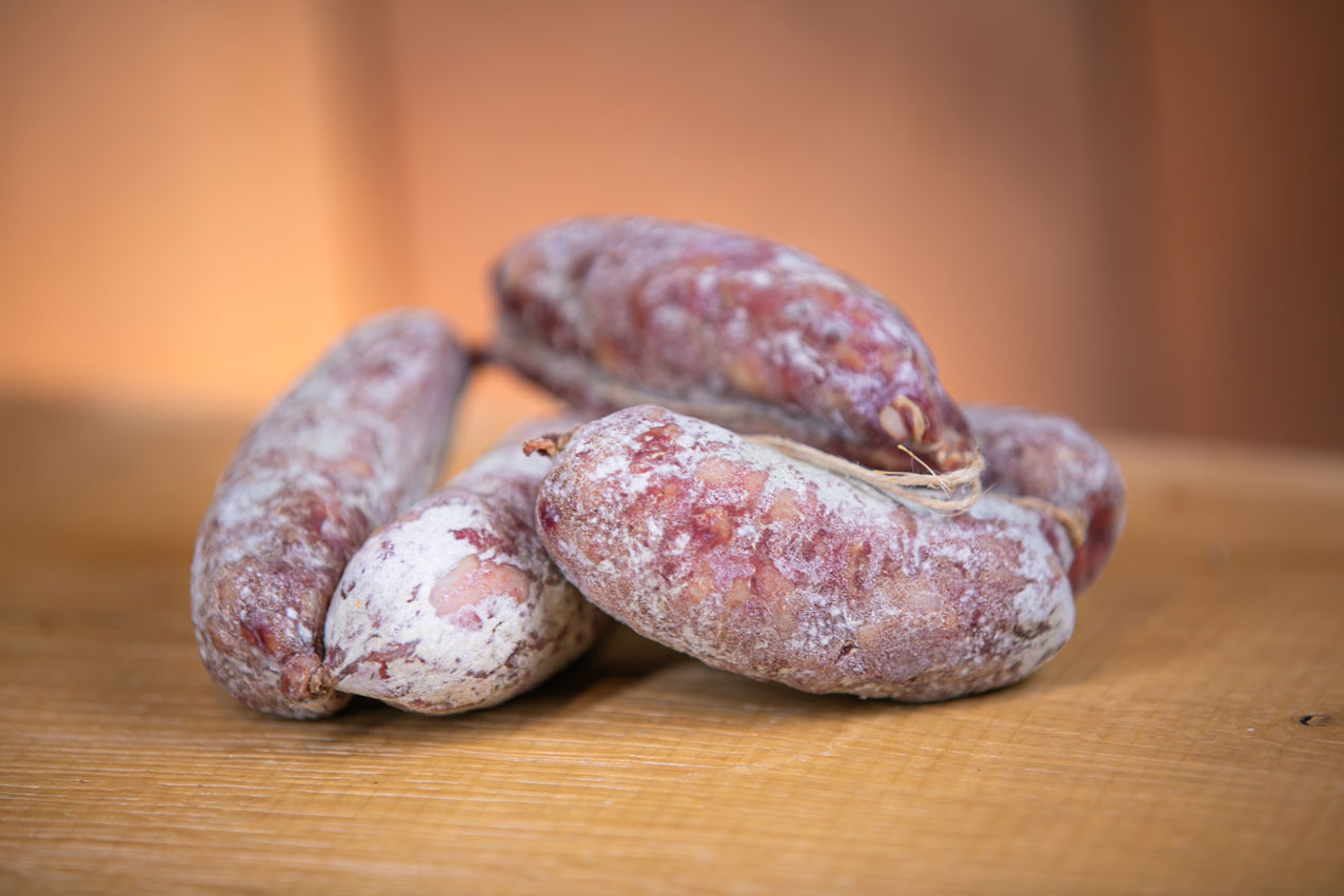 This particular salami is made exclusively with fine cuts of pork, it requires a relatively short seasoning (maximum 20/25 days) which gives to the product a sweet taste and a delicate aroma.
