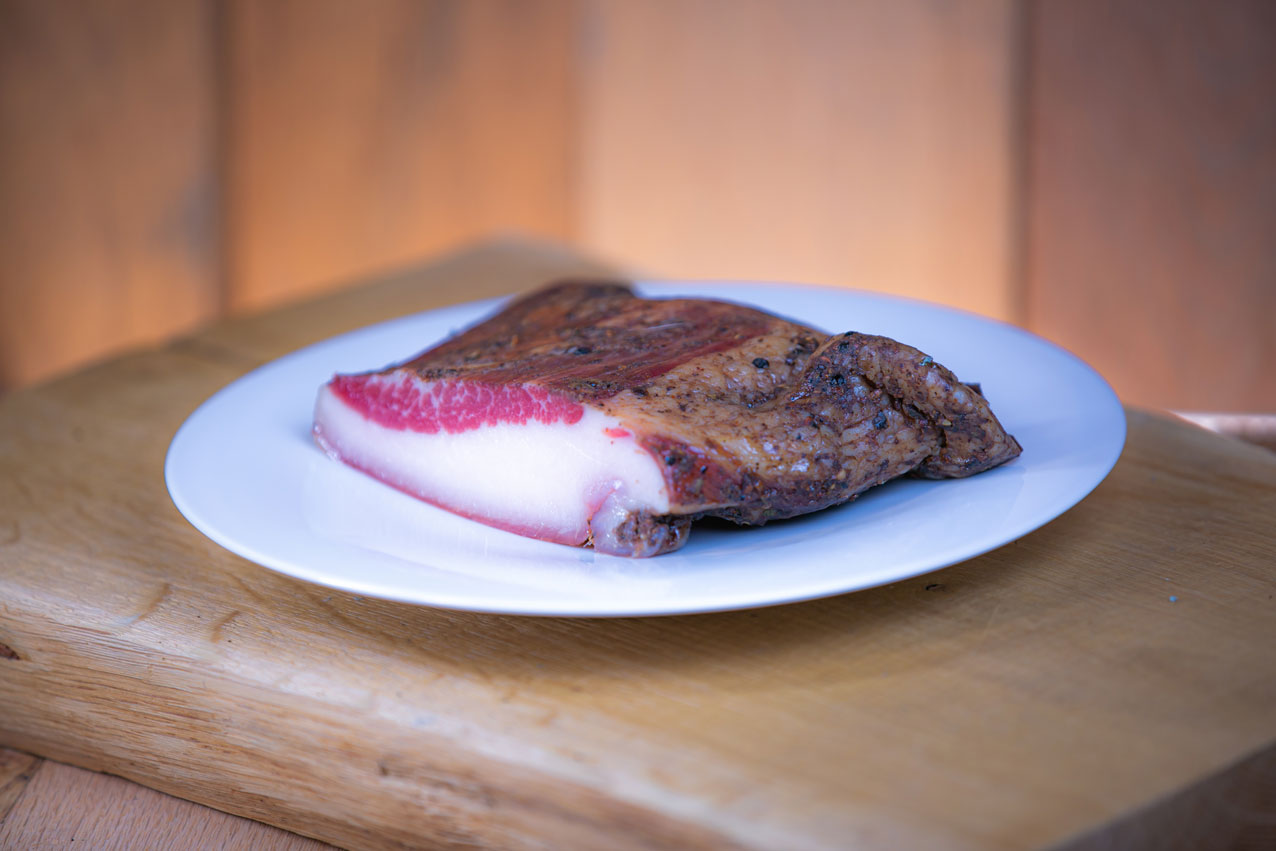 Our popular specialty is obtained from pork cheek and flavored with salt, split black pepper, juniper, garlic, natural flavors and white wine.